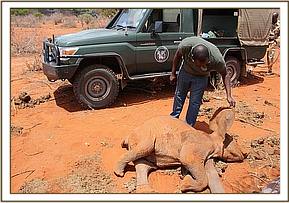 Whilst rescuing the first calf another report of a collapsed calf was received from Satao camp. The team rushed to find the barely breathing calf in nearby. He was stabilised with Vitamin B12 complex and IV fluid therapy. The calf once stabilized, was loaded onto a vehicle and transported to Aruba where together with the first calf were airlifted to Nairobi DSWT orphanage for care.