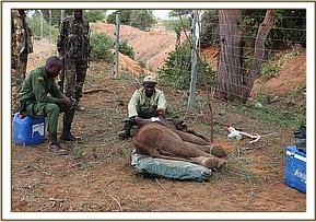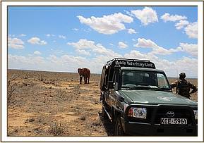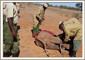 The Tsavo vet unit rushed to the area to ascertain the cause of problem. Attempts were made to help the recumbent cow onto her feet by use of ropes tied to the vet vehicle in vain as she was too weak to stand.