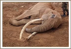 The Elephant cow appeared weak but was struggling to stand up. A rope tied to the vet unit vehicle and looped on her tusk was used to aid her onto her feet. She stood up and walked away slowly.