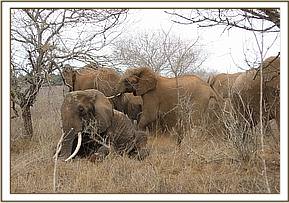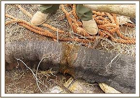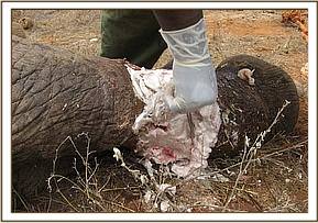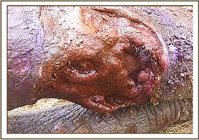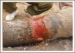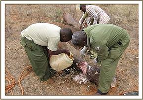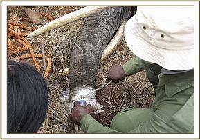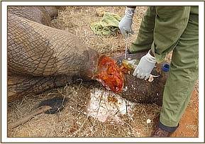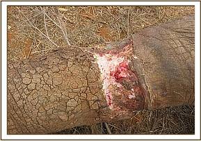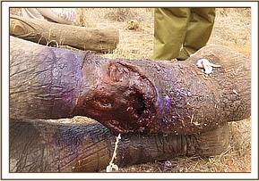 We had one elephant aged about 8-9 years at Kanderi in Tsavo East with an extensive injury caused by a snare on its mid right hind leg. The wound was deep, infected and with lots of necrotic tissues and maggots. The snare however had come off. We treated the wound topically and trimmed off much of the necrotic tissues. Large doses of a systemic antibiotic were given. There has been no further sighting of the elephant. The prognosis was nevertheless favourable.