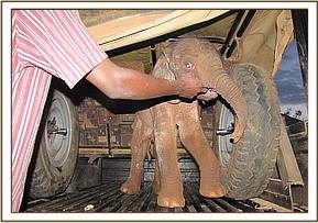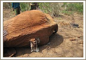 Two elephant calves were reported to be in need of rescue within a day of each other. One was rescued on the evening of 25th September atBachuma gate and one on the morning of the 26th at the pipeline. Both calves were very young and less than three months of age. The first calf was spotted by a KWS security team near the Nairobi-Mombasa road following people and vehicles, whilst the pipeline calf was found nearly submerged in mud. Both were rescued and airlifted to Nairobi elephant orphanage for care and rehabilitation.