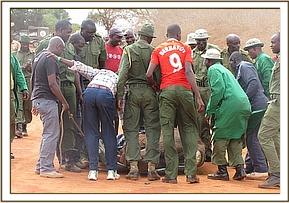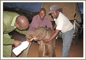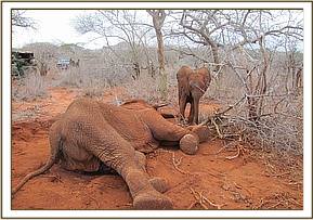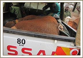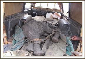 A case of an injured elephant calf was spotted near Taita Sisal Estate along the Mgeno boundary. The mother was moving very slowly and was followed closely by her calf. Both the mother and the calf had to be immobilized in order to carry on treatment of the adult female. They were both kept cool with water. The small penetrating injury on the right shoulder was diagnosed as being caused by a bullet wound. The wound was cleaned and on deep probing small bone fragments confirmed the diagnosis of a bullet injury. Treatment of both local and general was given and both the calf and the mother were woken up simultaneously. Prognosis of the case was put at 30% which is very poor. Both her and her calf are being monitored closely