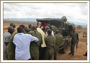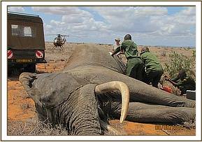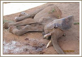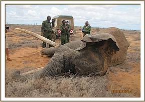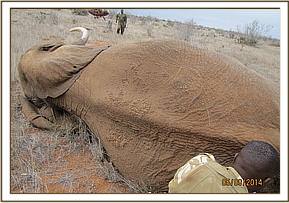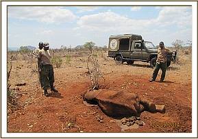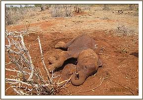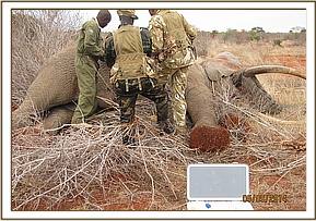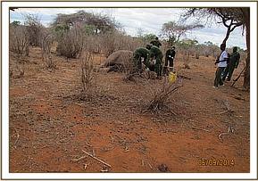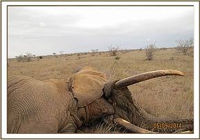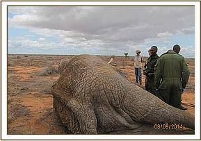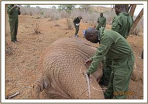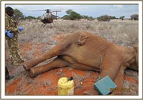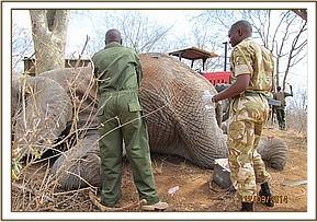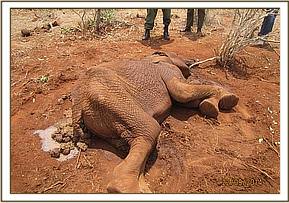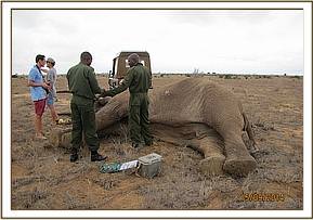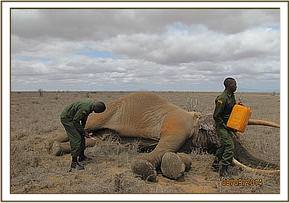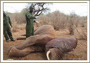 The elephant was immobilized by injection of 2 mgs of etorphine hcl into the ear vein. Lots of water was used to cool her. The body condition was estimated at 2/5 as muscle wasting was evident. The calf was loaded onto a truck and taken to Voi stockade for further medical attention. Intravenous dextrose solution managed to stabilise the calf upon arrival at the stockade. She succumbed two days later and the diagnosis was given as starvation. Cases of mortalities in young calves that are no longer suckling occur often in the parks especially during the dry season when forage and water is scarce.