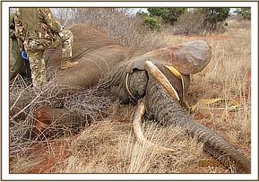 The elephant fell on sternal recumbency and was blocked by a tree on one side and a ditch on the other. A decision to attend to him and reverse the anaesthesia fast was the most feasible. The arrow head was removed quickly and wound cleaned and tincture of iodine applied.