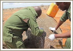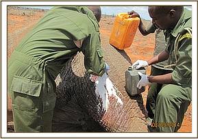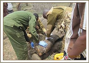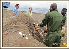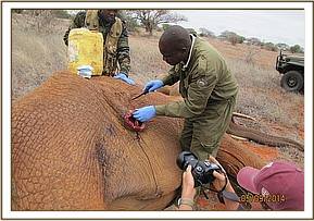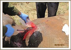 There was a wound on the upper part of the right thigh. The wound was reddish and appeared fresh but closer examination revealed a growth. The growth was cut off and the wound was cleaned using hydrogen peroxide mixed with water and doused with tincture of iodine. Wetted green clay was used to cover the wound. Long acting antibiotics and anti-inflammatory drugs were administered parenterally. The huge bull is one of the iconic big tuskers still remaining in Tsavo conservation area.