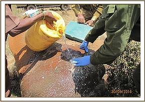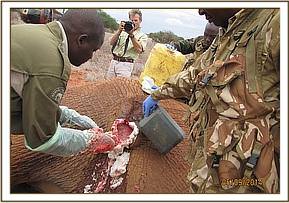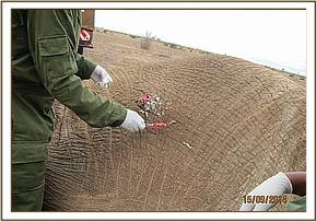 The wound was examined and found to be on the right side of the stomach and was on the process of healing. The suspected arrow wound was cleaned using hydrogen peroxide mixed with water and doused with tincture of iodine. Dexamethasone was administered intravenously.Reversal was by use of 60mgs of Diprenorphine Hcl in the ear of the elephant.