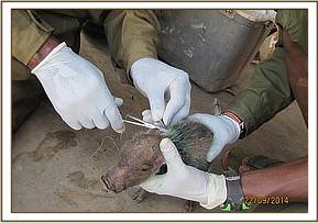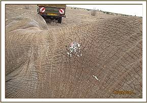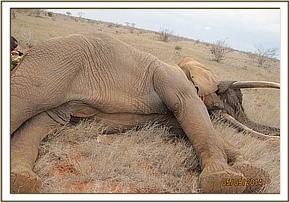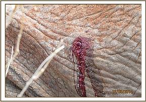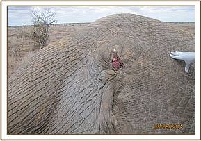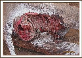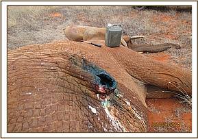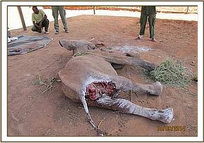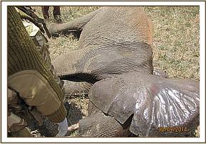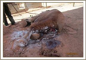The general exam revealed an emaciated young elephant with body score of 2/5. He was already recumbent and several attempts to lift him up proved futile. Mucous membranes were pale with very cold extremities a sign of massive blood loss. The perineal area had a huge lucerations caused by Hyena attacks. 2 mgs of etorphine were injected intravenously to reduce pain. The prognosis of healing being very poor, a decision euthanize was made to end his suffering.