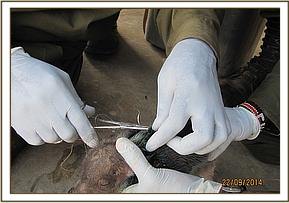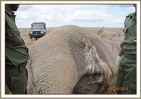 The elephant cow was spotted few minutes after the bull was treated with a big wound on the side of the stomach and pus dripping out. Immediately preparation to treat was mobilized