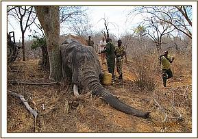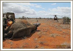 The elephant was spotted near Aruba dam along Voi River with fresh blood dripping from the ramp area. The huge bull was suspected to have been hit with an arrow. The team moved in swiftly and drugs were prepared for chopper darting.