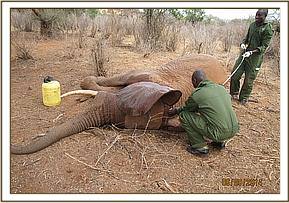 The young elephant orphan was reported to have been attacked by hyenas near Ithumba stockades and rescued by the stockade staff. The vet was airlifted to Ithumba from Voi.