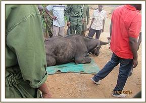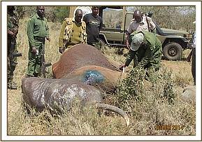 The buffalo was immobilized using 7 mgs of Etorphine mixed with 60 mgs of Xylazine hydrochloride and went down in 12 minutes. An animal stretcher was used to load the buffalo unto a land cruiser pickup and transported to Rhodesia area along Tsavo River where it was offloaded and given antibiotic and multivitamin covers before anaesthesia reversal.