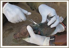 The warthog piglet was rescued after sustaining deep puncture wound from an attack by eagle predators near Galana ranch east of Tsavo east national park. The piglet was feeding well on milk.