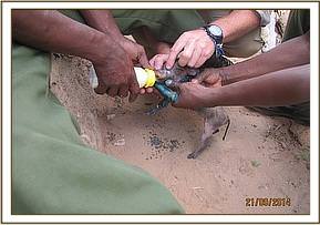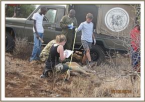 The exercise was undertaken at night unsuccessfully through call ups for two days. On third day a pride spotted near kuku plains and immobilization was using 300mgs of Ketamine Hcl mixed with 4 mgs of meditomidine hcl. A repeat dart was used to ensure effective anaesthesia is achieved. Several samples were taken including blood and tissue samples and the collar well fitted and mounted around the neck with screws. Antibiotic and multivitamins were administered as cover.
