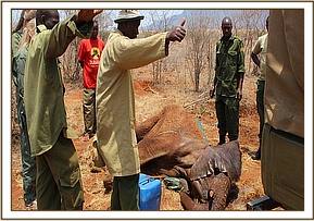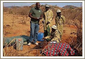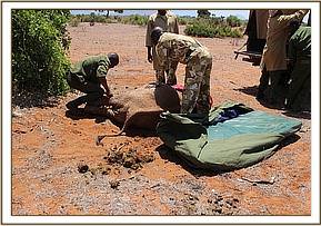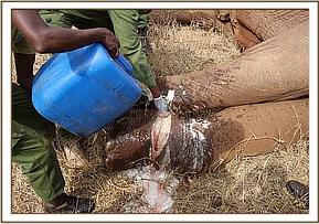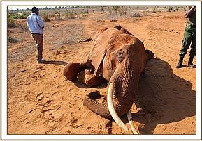 Further away in Satao another calf aged at 4 years had collapsed and the mother nearby was examined, cooled down with water whilst the calf was covered with a blanket because he appeared in shock and 20 cc of dexamethasone Hcl administered through the ear vein followed by a bolus of 50% dextrose by slow IV. The breathing and pulse improved. Further administration of antibiotics, Vitamin B12 complex and more IV fluid therapy was instituted.