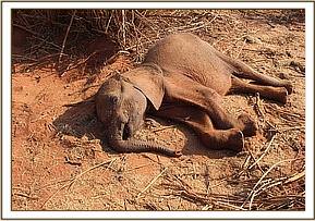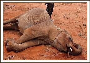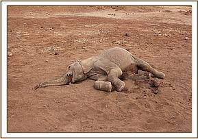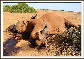 While patrolling the park, the vet team ran across a 5-year-old Elephant carcass near Rhino area of Tsavo East. Close examination of the calf revealed that it was already dead and blood oozing from the trunk.