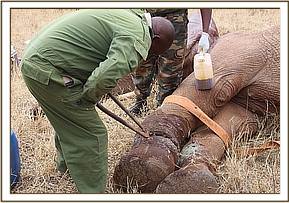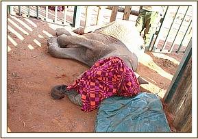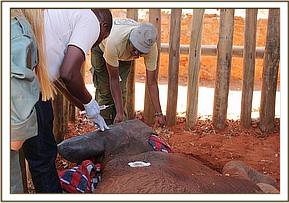 The vet team together with the Voi stockade team rushed to the area to find the baby elephant barely able to breath and flat on the ground. The calf was covered with a blanket because he appeared in shock and 20 cc of dexamethasone Hcl administered through the ear vein followed by a bolus of 50% dextrose by slow IV.
