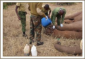 The carcasses were rolled over to expose the left flank and autopsy undertaken with no signs of external injury observed. Tusks were retrieved and taken for safe custody.
