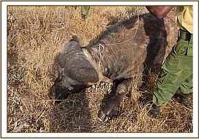 The not so tight wire snare around the neck was removed. Long acting Tetracycline and Dexamethasone were administered parenterally. Prognosis is good. Anaesthesia was reversed using Diprenorphine Hcl at 3 times the etorphine dose mixed with 0.5 cc Atipemazole hcl administered intravenously.