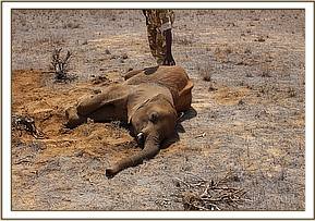 A report was made by tour drivers of an elephant calf that had collapsed near Aruba water wind mill, Tsavo East and another decomposed carcass suspected to belong to a mid-age female also nearby. The Tsavo vet unit visited the area to ascertain the cause of the problem. Close examination of the calf revealed that it was already dead. The carcass was pulled away from the road.