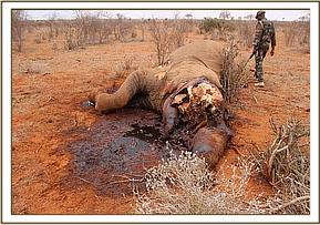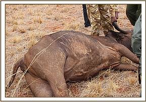 The carcass was lying on the left flank and at mid-advanced state of decomposition. There was scavenger activity on the carcass with the tusks still intact. The skin was removed from carcass to expose the whitish subcutis and examine any penetrating wounds but none were found.