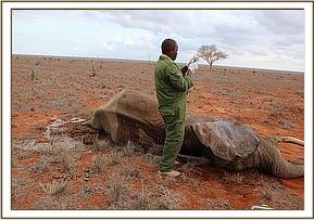After the vet team rescued the elephant carcass near the lodge within the Tsavo East National Park. The Tsavo vet unit visited the area to ascertain the cause of death. The carcass was lying on the left flank and at an advanced level of decomposition. No external injuries were observed. Autopsy was undertaken and no lesions were seen apart from the poor body condition. Tusks were removed and taken for safe custody.