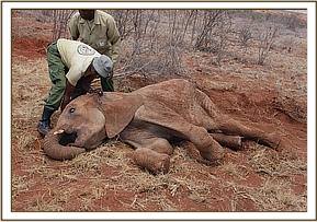 A report was made by tour drivers of one elephant calf that was lying down near a road at Irima area of Tsavo East. The vet team together with the Voi stockade team rushed to the area to find the young elephant flat on the ground, emaciated and unable to stand up.