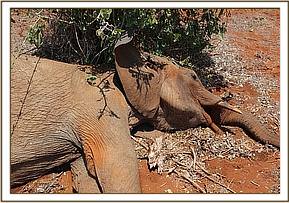 A report was made by DSWT patrol aeroplane of a mother elephant with a sick calf as well as another lone elephant calf seen lying down near Ashnil Aruba lodge. The Tsavo vet unit visited the areas to ascertain the causes of death.