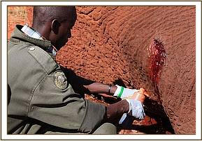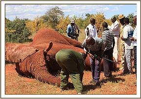 The team moved in quickly to help him. A twig was placed in his trunk to ensure the airways remained open and water poured over his ears to keep him cool throughout the treatment.