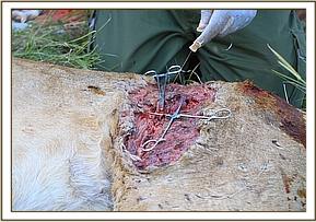Her left tibia and metatarsal bone were severely bitten into and subsequently the wounds were infested with fly larvae, these were all cleaned and flushed out. Throughout the operation she was given a drip as she was extremely dehydrated. Finally extensive antibiotic anti-inflammatory drugs were administered.