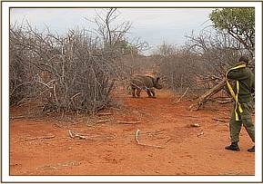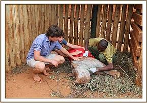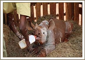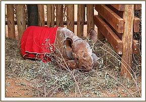Together with the Kenya Wildlife Service's Tsavo Rhino Monitoring Unit the DSWT Voi Elephant Keepers traveled to the calf's location and captured her. She was taken directly to the Voi stockades where she is presently having treatment for her wounds and taming down. She has been named Sobo and it is felt that when she is stronger she will be moved to Nairobi National Park to grow up together with the other black rhino orphans in our care and eventually integrate back into the Nairobi National Park black rhino population.