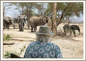 On the 15th August Dr Poghon was able to return and perform these operations close to the Orphans’ mudbath venue. All the ex-orphans came to drink that day accompanied, as they often are, by friendly big wild bulls who, taking their cue from our orphans, have become amazingly relaxed in the company of the Keepers and visitors both at the stockade compound, and also at the mudbath venue. Amongst them on this day was the big tusker called “Mshale”- whose life we have been able to save on two previous occasions by removing poisoned arrows from his body. This time he had a suspicious looking wound near his shoulder which could be yet another arrow wound.