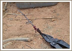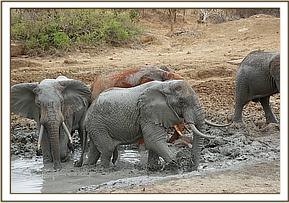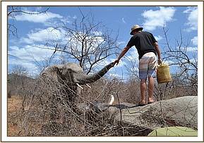 Attention now turned to the big tusker, “Mshale” who was wandering away from the drinking trough at the time, the tractor having been summoned to be at hand should he need to be turned over in case he fell on the wrong side. The moment the immobilizing dart struck Mshale in the rump, he ran off at speed. A search through the dense bush then ensued to establish where he had fallen, which turned out to be not terribly far away. There he lay like a red mountain, dwarfing the men that surged around his huge recumbent body as the vet investigated the wound. Fortunately the wound was on the upside of his body. Also very fortunately, no arrow head was imbedded, so Mshale was revived, having had the visibly infected wound anointed with the magic green clay.