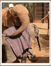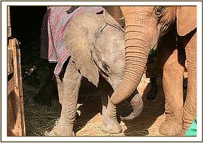 Baby Namolok was about 9 months old, and although weak, managed to summon enough strength to push her Keeper around a little upon arrival, before hungrily downing 3 pints of milk, along with gallons of water fortified with rehydration salts. But, for a wild caught 9 month old elephant, she was far too docile for comfort, and this is never a good prognosis for success. Nevertheless, she fed well throughout the night, and in the morning had bonded with her Keeper and was suckling his fingers. The other elephants were brought round to meet her, and she was instantly embraced by them, showering her with concern and love. Lenana, especially, was enchanted with this new baby, tenderly touching her and keeping her ever so close.