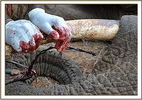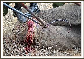 The snare wound was deep and the flesh had grown around the cable, making it at first appear as if there was no wire remaining. But after cutting deep into the flesh the winch cable was located and pulled away from the flesh and bone. The heavily infected wound was cleaned and treated. Long-lasting anti-biotic was given and green clay packed into the wound to protect it from further infection before the bull was revived . With a lot less discomfort the bull slowly wandered away towards the safety of his herd which was still nearby whilst the whole team hoped for the best for this beautiful elephant.