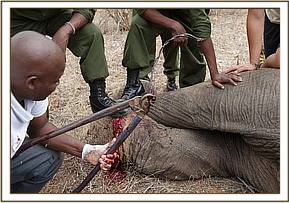 In this case, Dr. Poghon of the Tsavo Mobile Veterinary Unit treated an urgent case on the 31st of July. This young bull had been reported nearly three weeks earlier with a cable snare around his foot, yet with continuous aerial surveillance and the daily efforts of the DSWT ground patrol teams, as well as the Tsavo Veterinary unit being on site the bull eluded everyone in the dense comiphera bush.