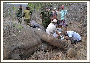 From the helicopter, alongside the pilot and Nick who was guiding the aircraft to the correct location, the vet successfully darted the bull, which went down in less than ten minutes whilst the helicopter landed on a rock kopje nearby. The team went in on foot to the site where the elephant lay down with the extra support of the ground teams who were guided in using GPS coordinates.