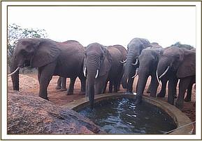 Ndara was there too, having made a complete recovery from her horrendous poisoned arrow wound which required treatment on two different occasions in April 2012. She remained at the stockades for many months after her second operation while she made the slow journey back to full health. Her recovery from what had the potential of being a life threatening injury as the arrow had penetrated the lower joint of her left front leg is remarkable. When the joints are affected from arrow, spear or bullet injuries the prognosis is always extremely guarded. On Sunday the ex-orphans spent the morning at the stockades taking their fill of water while enjoying the youngsters company after which they wandered off into the browsing fields together with the dependent herd and the Keepers.