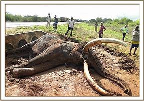 As the sun rose a crowd gathered with people hungry to take the fresh meat. The Kenya Wildlife Service and DSWT Mtito Antipoaching team arrived soon after the accident, protecting the carcass, removing the tusks and dragging the body into the shelter of the bush.