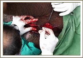 What the vets identified did not surprise the keepers, their suspicions were correct, Alamaya was in fact a male elephant! The frightening fact being that the wounds to the genital area had been so severe, this could not have been known without internal examination. The vets carefully continued with the operation and when they identified the urethra they were able to allow a build-up of urine to escape in some quantity. They then inserted a catheter and around this inserted and stitched into place a plastic cylinder, through which Alamaya would be able to pass urine without any discomfort. This cylinder will also act to ensure that as the surgical incisions from the operation heal, the scar tissue would not again form around the urethra and prevent Alamaya from urinating properly.