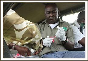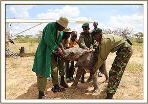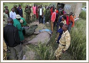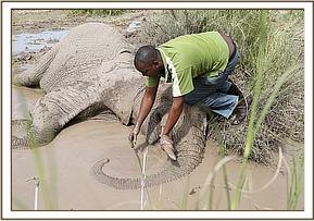Dr Lekololo soon arrived in Amboseli with the Keepers and undertook the journey from the airstrip to the location of the sickly mother and her calf. The veterinary team were quick to make the decision that this female would need to be euthanized so serious was her predicament. The baby bull was successfully darted, and captured that day and has been named Ziwa.