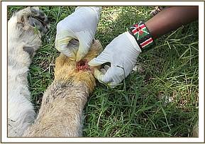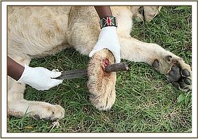 Whilst these arrangements were taking place second call was received, this time from the Maasai Mara where an injured lioness, with a spear lodged deeply in her front paw, had been located and required the attention of a vet urgently. The lioness had been speared by Masai herdsmen. The rangers of the area had been monitoring her throughout the night ensuring her safety against hyenas in order for the KWS to officially make the report. KWS, in partnership with the DSWT, gave the go ahead for a Sky Vets operation to take place, as the DSWT-funded Mara Mobile Veterinary Unit was on leave. This operation saw KWS Field Veterinary Officer Dr Mijele flown from Nairobi by the Sky Vets program to the Mara in order to remove the spear and treat the lion’s wounds.