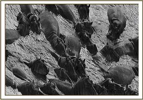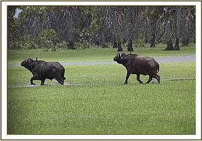 By the first week of October 2012 Amu Ranch was experiencing yet another extreme dry period. Many waterholes had dried up with only two remaining Mkumbi and Ivitho which are both frequented by Somali cattle forced south by arid conditions in their traditional grazing grounds. The vast numbers of Amu buffalo were clearly struggling with the harsh conditions as well, accessing the water during during the night. During this drought buffalo were dying daily, alongside other animals including eland, zebra and waterbuck. As the illegal cattle incursions had grazed the Amu grass to the ground, the buffalo were starting to venture onto farmland to find food and water and in doing so killed one and injured two community members. Desperate times for all. Hippos could do nothing to escape the hot sun and lay in the mud clasping onto the remaining moisture for their sensitive skins. Even pelicans moved into Mkumbi in hundreds. The drought was well and truly biting.