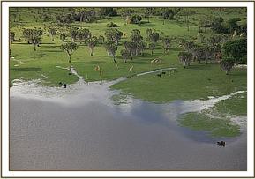 Yet the rains were on their way and through October 10th to the 13th the skies suddenly opened. The majority of the rain fell further to the west of Amu but the result was that overnight the land was swamped. What was a parched dry land suddenly became an oasis with life in abundance. Water was flowing over 6ft deep across causeways, Ivitho lake was so full that the Somali manyattas (homesteads) around its edges were under water and Mkumbi was a flowing river. Fish were instantly breeding and repopulating all the waterholes that filled up and the buffalo were frolicking in the water, which literally spread throughout the land. Even the giraffe showed up in large numbers again, knee deep in water.