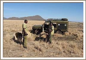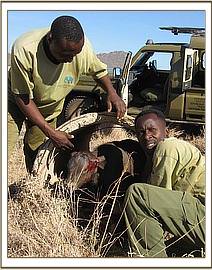 When the rescue team arrived, which included some of our Voi Elephant Keepers, and Mobile Veterinary Unit, they found the lioness lying inside the pipe with the baby buffalo beside it, apparently in good health but dazed and resigned to its fate. They moved their vehicle closer in order to get a better view, and saw that the lioness was trying to protect the calf by shepherding it gently deeper inside the pipe. The team then managed to flush the lioness out, and she emerged carrying the baby buffalo by the neck, again as she would her own cub. However, the calf proved too heavy, and eventually she dropped it to make good her escape. The Mobile Veterinary Unit and Keepers then moved in to retrieve it.