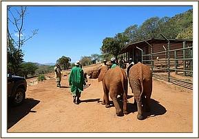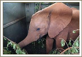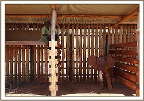 And so it was very early on the 10th of November at the Nairobi Nursery, under a dark cloudy sky full of rain, the Keepers and Robert and Angela rose early and began preparations for the girl's move to Tsavo. Ishaq-B, Naipoki and Kihari were all given Stresnil, which calms them during the journey, before one at a time they were led to the elephant-mover truck. Ishaq-B was enticed first to the truck with a couple of bottles of milk, before Naipoki was next who drank more than three bottles of milk. Then Kihari was finally brought to the truck and all three were quickly closed in the vehicle and ready to get going. The Keepers Sammy and Adan were chosen to accompany the orphans down to Tsavo and look after them in the back of the truck during the journey. As the elephant-mover truck set off into the darkness all of the Keepers at the Nursery waved their farewells before returning to the stockades where the remaining orphans were waiting for them.