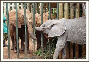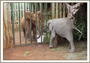 They say that things go in threes and just a week after the rescue of little Narripi, at 2 a.m. during the early hours of 7th September 2005, a call came from David Njoroge, Head of the Burra De-Snaring Team, to say that another orphaned baby bull elephant had been brought to the Voi Stockades; that it was just a year old, and therefore milk dependent, and would need to be airlifted to Nairobi first thing in the morning. In the meantime, Mweiga was with the baby, comforting and calming it, and it had taken some milk and water.