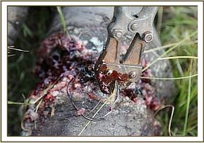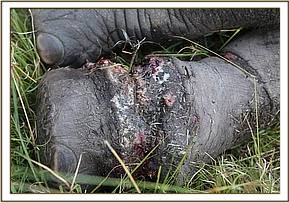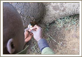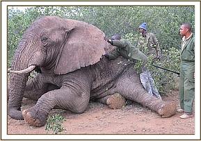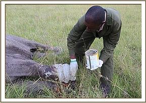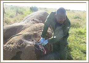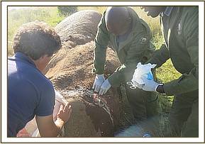 The snare was deeply embedded in the lower part of the forelimb and had to be removed using wire cutters. The resulting wound was cleaned with water, hydrogen peroxide and iodine, before being packed with green clay. The vet then administered antibiotics before reviving mother and baby to reunite with their herd.