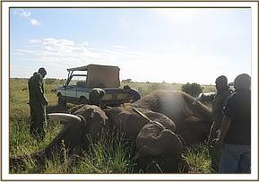 The third case saw a KWS veterinary officer flown to the Masai Mara on the 24th December 2014, Christmas Eve, to treat a young elephant with a snare embedded in its forelimb. The young elephant was easily darted but protected by its mother and family herd. Eventually a team of vehicles managed to move the herd away but the calf’s mother remained, stood over her then recumbent infant and charging any vehicle that came to close. The decision was made to dart the mother as well in order to reach the young calf to treat, and as soon as she was down the team rushed in to treat the young elephant’s injuries.