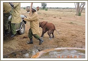 It was a normal day on the 19th of July down in Tsavo with the Voi elephant keepers and the Tsavo Mobile Veterinary Unit engaged in a normal day’s activities when they received a call notifying them that a calf had fallen into a water trough at the Sentrim/Tarhi camp
