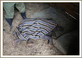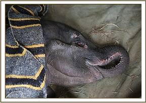 The fate of this babys mother was never confirmed, but judging by his condition he had obviously been without her for quite some time. It is assumed that he had inadvertently strayed onto the road through the electrical fence where his mother was unable to reach him, or perhaps that he was orphaned and in his confused state got under the electrical fence in search of company, but either way by the time he was rescued he had clearly been alone for a long time.